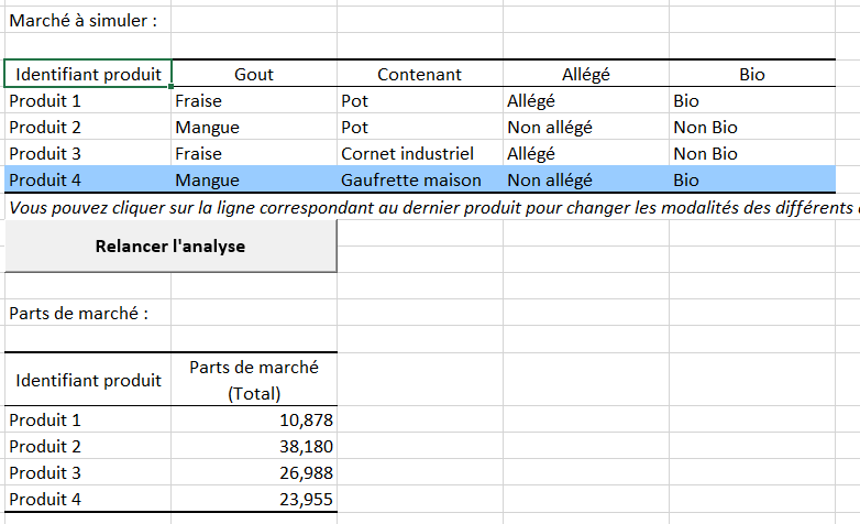 On voit, dans cet exemple que les parts de marché du nouveau produit (produit 4) changent assez fortement, on passe de 35% à 24%. On a donc tout intérêt à lancer la nouvelle glace avec un gout de framboise car les parts de marché sont plus importantes.