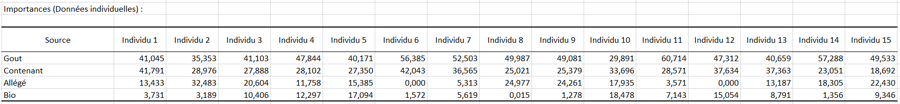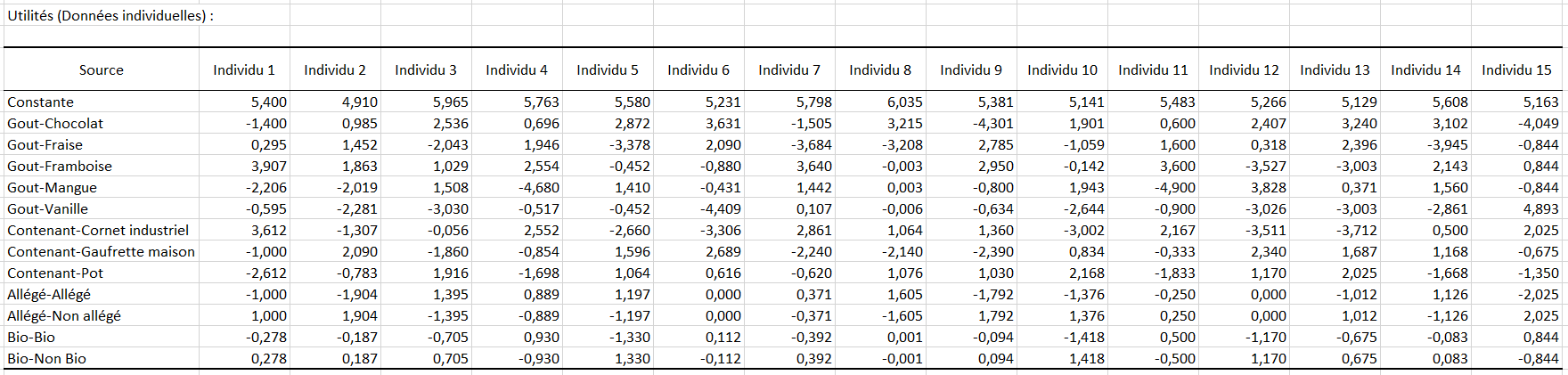 Ces premiers résultats montrent que le goût et le contenant sont les facteurs (attributs) les plus importants aussi bien au niveau individuel qu'au niveau de la moyenne. Le fait que la glace soit au chocolat ou à la framboise et dans un contenant de type gaufrette maison a un effet largement positif si on regarde les utilités (en termes de moyennes).