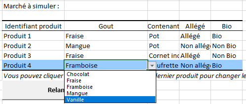 Afin de voir rapidement l’impact d’un changement de modalité sur le nouveau produit (par exemple si on souhaite voir quelles seront les parts de marché si la glace a un parfum vanille au lieu de framboise), vous pouvez modifier les modalités du dernier produit (ligne bleue) dans le tableau Marché à simuler en cliquant sur les modalités à changer.