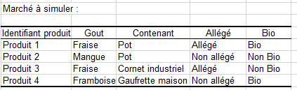 L'intérêt principal de l'analyse conjointe est qu'elle nous permet de simuler les marchés même si les produits du marché n'ont pas été testés par les individus interrogés. Dans notre cas, le marché des glaces dans une ville est analysé et on voudrait savoir l'impact et les parts de marché que l'on pourrait espérer pour un nouveau produit (appelé produit 4). Ce produit est une glace bio à la framboise, non allégée et servie dans une gaufrette maison. On sait que sur le marché actuel on a 3 glaces qui ont des caractéristiques différentes. Voici le tableau du marché à simuler :