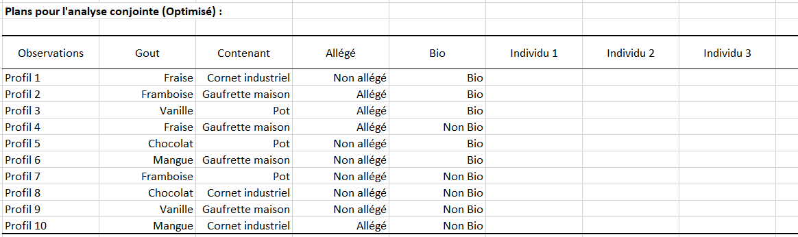 A partir de ces facteurs, on peut obtenir 60 produits potentiels différents. Les juges devant évaluer les produits ne seront pas capables d'en analyser autant. On va donc se servir de plans d'expériences afin de réduire le nombre de produits présentés aux personnes interrogées.