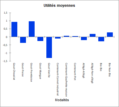 Les moyennes des utilités et des importances sont aussi calculées et représentées sur des graphiques, cela donne une idée de l'importance des différentes modalités et des différents facteurs.