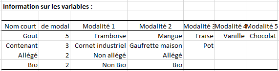 La première étape de l'analyse conjointe qui se fait en collaboration avec des experts du marché des glaces est le choix des caractéristiques importantes pour bien définir une glace. Les facteurs sélectionnés sont : 1. Le parfum (Framboise, Mangue, Fraise, Vanille, Chocolat) 2. Le contenant (Cornet industriel, Gaufrette maison, Pot) 3. La glace est-elle allégée (Allégée, Non allégée) ? 4. La glace est-elle bio (Bio, Non bio) ?