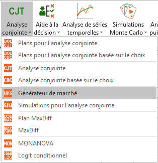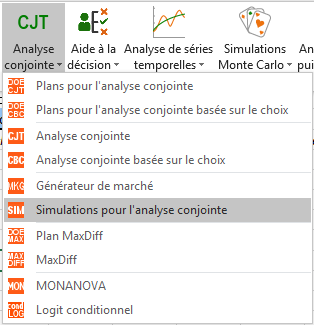 Une fois le tableau du marché généré, vous pouvez lancer la simulation pour l’analyse conjointe. Pour cela, cliquez sur l’icône CJT et choisissez la fonction Simulations pour l'analyse conjointe.