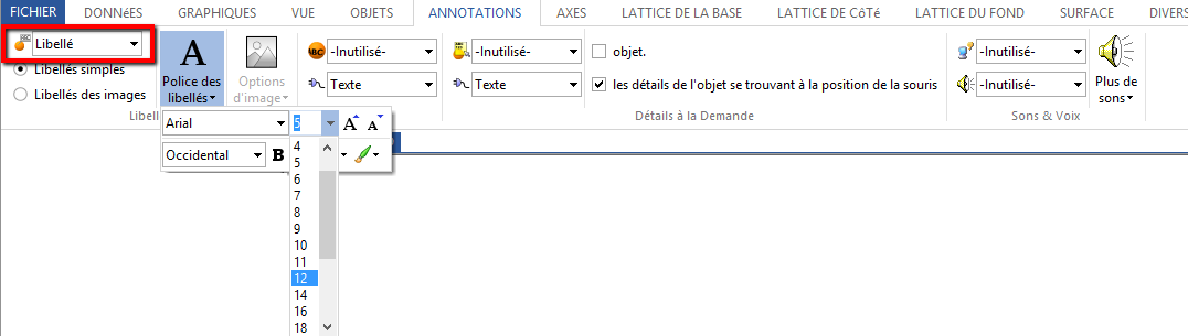 Nous utiliserons les noms rangés dans la colonne Libellés afin d’étiqueter les points. Dans l’onglet Annotations, sélectionner la colonne libellés dans le champ en haut à gauche. Augmentez la taille de la police pour une meilleure lisibilité.