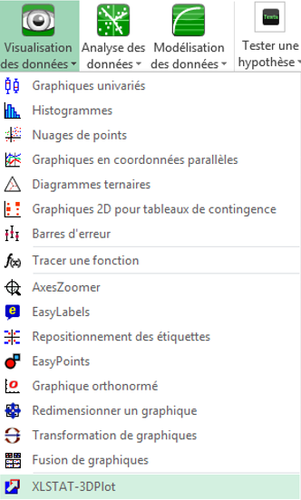 Une fois XLSTAT-Pro lancé, sélectionnez le menu XLSTAT / Visualisation des données / 3DPlot, ou cliquez sur le bouton correspondant de la barre d'outils Visualisation des données (voir ci-dessous). Si le bouton n'est pas visible, vous devez installer XLSTAT-3DPlot. XLSTAT-3DPlot est disponible en téléchargement sur le site d'XLSTAT.