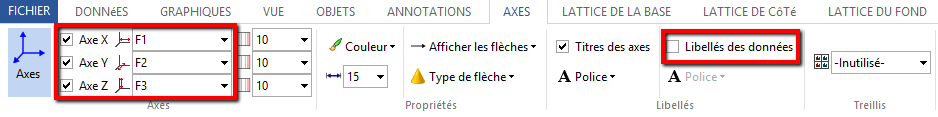 Cliquez sur l’onglet Axes. Sélectionnez F1, F2 et F3 dans les champs X, Y et Z, respectivement. Désactivez l’option Libellés des données, les libellés des axes n’étant pas très importants dans le contexte de l’analyse factorielle des correspondances.