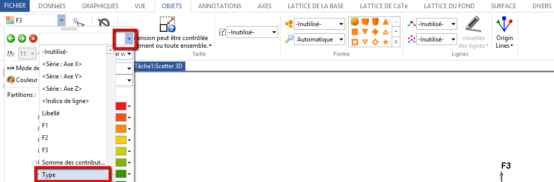 Coloration : Il serait intéressant de colorer les points en fonction de la colonne « type ». Dans l’onglet Objets, sélectionner la colonne Type au sein de l’option Coloration (en haut à gauche).