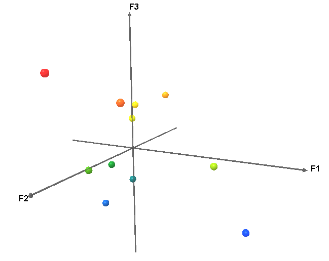 Taille : Il serait également intéressant de modifier la taille des points de manière à ce qu’elle soit proportionnelle à la colonne « somme des contributions ». Sélectionner cette colonne dans le champ correspondant dans l’onglet Objets. Notez que ceci peut rendre l’interprétation en 3D un peu plus compliquée. Ainsi, nous ne le ferons pas dans ce tutoriel. Dans ce contexte, l’utilisation de filtres pour éliminer les points associés à une somme des contributions inférieure à un certain seuil peut s’avérer utile (cf. dernier paragraphe dans ce tutoriel).