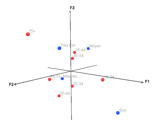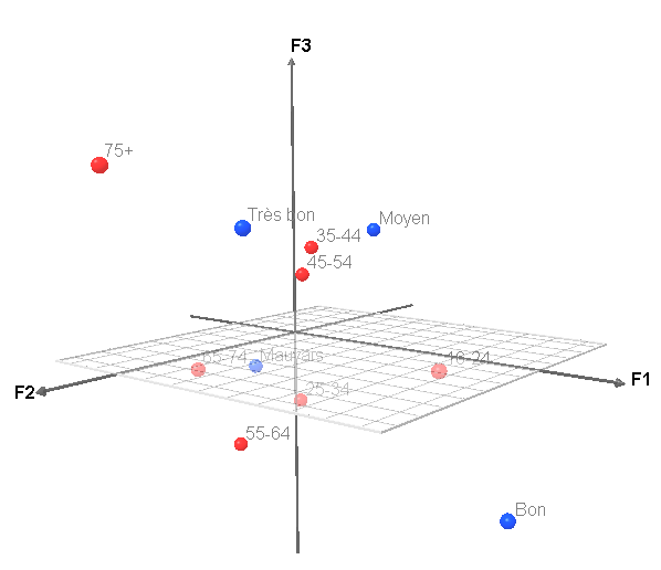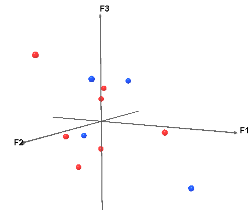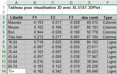 Les données correspondent aux coordonnées des profils lignes et colonnes extraits de l'analyse factorielle des correspondances faite dans le tutoriel sur l'AFC. Grâce à XLSTAT-3DPlot, nous pourrions créer une carte factorielle en trois dimensions.