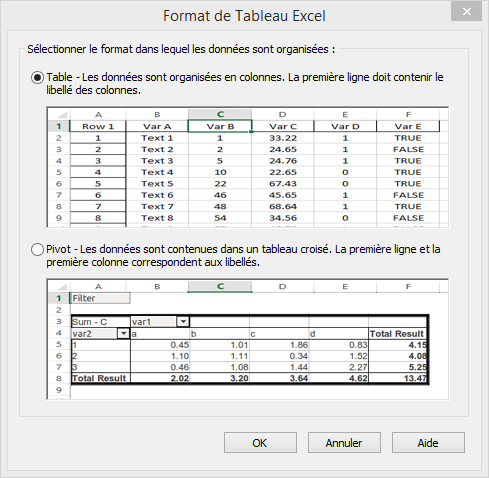 D’abord, une boîte de dialogue apparaît et permet de sélectionner le format des données en entrée : une table avec les observations en lignes et les variables en colonnes ou un pivot (tableau croisé).