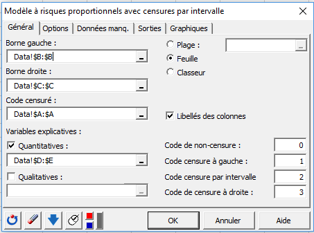 Sélectionner les données de la borne gauche de l’intervalle (Left), de la borne droite de l’intervalle (Right), les données de censures (Censored), ainsi que les variables quantitatives (Stage et Dose).