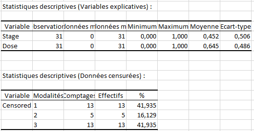 Des statistiques descriptives sur les variables quantitatives ainsi que sur les données censurées sont affichées :