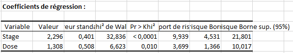 Le tableau suivant est un tableau classique de modèle de régression avec, en supplément, le rapport de risque.