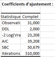 Le tableau suivant résume les indices de qualité du modèle. Ces statistiques sont utiles pour juger de l’adéquation d’un modèle et pour le comparer à d’autres modèles.