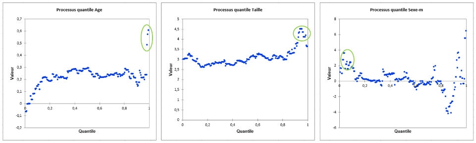 Tout d’abord, nous allons lancer une phase « exploratoire » via le Processus Quantile pour obtenir un panorama des valeurs des coefficients pour différents quantiles et ainsi être capables de détecter les quantiles qui nous intéressent plus particulièrement. Dans cette étape préliminaire, seuls des résultats généraux sont générés (davantage d’options sont disponibles dans la seconde étape).