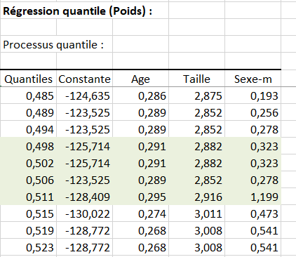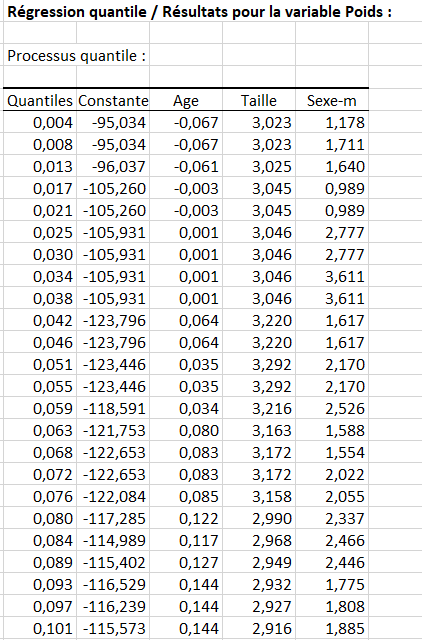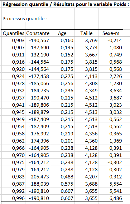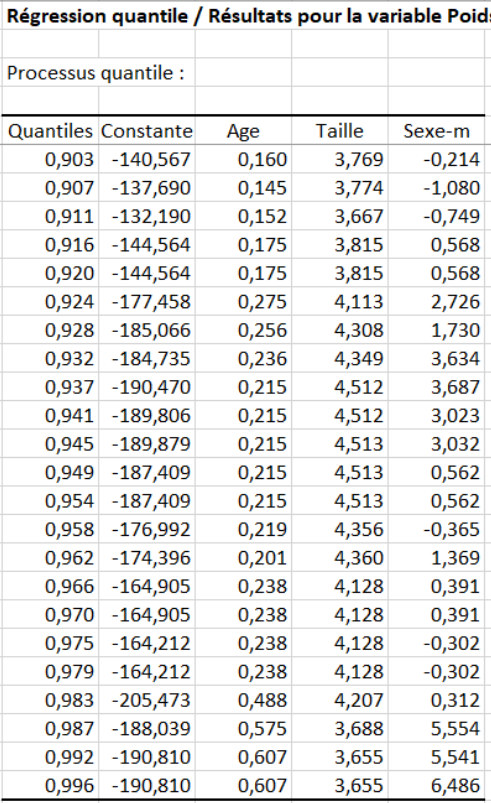 tandis que d’autres résultats de la régression quantile suggèrent que le Sexe a un effet plus important sur le poids des enfants ayant les poids les moins élevés (alpha < 0.1).
