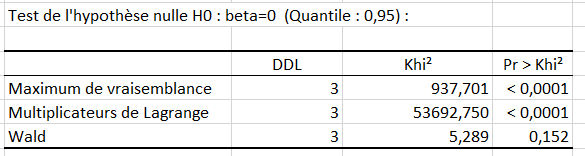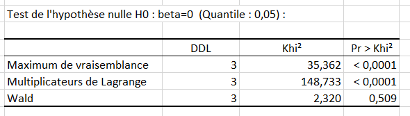 3 tests sont utilisés : Maximum de Vraisemblance, Multiplicateurs de Lagrange et Wald. Etant donné que la probabilité associée au Khi² est dans ce cas inférieure à 0.0001, cela signifie que l'on prend un risque de se tromper de moins de 0.01% en concluant que les variables explicatives apportent une quantité d'information significative au modèle.