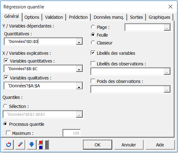 Une fois le bouton cliqué, la boîte de dialogue correspondant à la Régression Quantile apparaît.