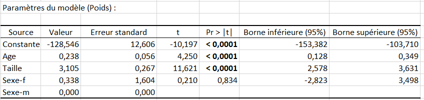 Le tableau de significativité du modèle est un résultat qui doit être analysé attentivement (voir ci-dessous). C'est à ce niveau que l'on teste si l'on peut considérer que les variables explicatives sélectionnées (la taille et l'âge) apportent une quantité d'information significative au modèle (hypothèse nulle H0) ou non. En d'autres termes, c'est un moyen de tester si la moyenne de la variable à modéliser (le poids) suffirait à décrire les résultats obtenus ou non.