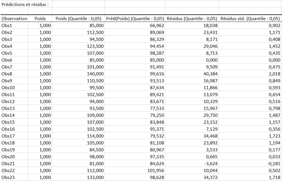 En conclusion, la taille, l'âge et le sexe permettent d'expliquer plus de 90% de la variabilité du poids. Une part importante de la variabilité du poids est donc expliquée par le modèle de régression quantile.