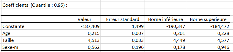 D’autre part, il est important de noter que, comme pour l’ANCOVA, il est possible de mélanger des variables quantitatives et qualitatives en Régression Quantile. Dans trois autres tutoriels cet exemple est traîté, d’abord avec la Taille seulement (régression linéaire), puis en ajoutant l'Age (ANOVA), et enfin le Sexe (ANCOVA) comme variables explicatives.