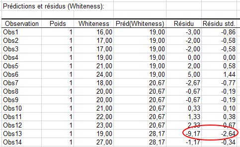 Le tableau suivant présente l'analyse des résidus. Une attention particulière doit être portée aux résidus centrés réduits, qui, étant données les hypothèses liées à l'ANOVA, doivent être distribués suivant une loi normale N(0,1). Cela signifie, entre autres, que 95% des résidus doivent se trouver dans l'intervalle [-1.96, 1.96]. Etant donné le faible nombre de données dont on dispose ici, toute valeur en dehors de cet intervalle est révélatrice d'une donnée suspecte. Nous pouvons ici identifier une valeur suspecte (13ième observation) le résidu étant égal à -9.17. Afin d'expliquer cette valeur, on pourra vérifier que le bon dentifrice a bien été donné à la personne en question, ou analyser la raison pour laquelle la réaction du patient au dentifrice a été plus faible que pour les autres.