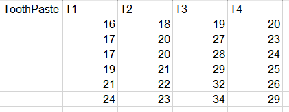 Les données correspondent à une expérience où 4 dentifrices ont été chacun testés sur 6 personnes afin que soit mesuré leur impact sur la blancheur des dents. Tous les patients utilisaient auparavant le même dentifrice.