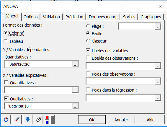 Dans XLSTAT, il est possible de sélectionner les données de deux façons différentes pour l’ANOVA. La première est sous forme de colonne, une colonne pour la variable dépendante, une autre pour la variable explicative.