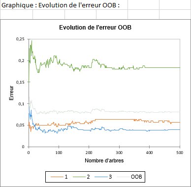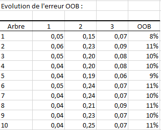 Le dernier tableau affiche l’évolution de l’erreur OOB en fonction du nombre d’arbres. La ligne i du tableau correspond à l’erreur OOB commise en prenant en compte tous les arbres jusqu’au i -ème. En plus de l’erreur OOB on a aussi une colonne par modalité représentant l’évolution de l’erreur commise sur chacune des modalités de la variable réponse.