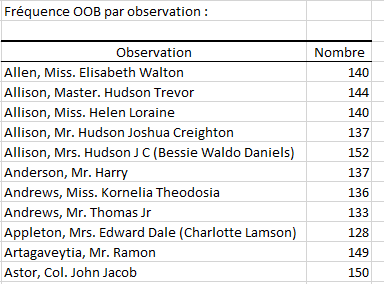 Le tableau suivant affiche pour chaque observation de l’ensemble d’apprentissage le nombre d’arbres dans lesquels elle est OOB.