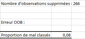 Les premiers résultats affichés sont le nombre d’observations de l’ensemble d’apprentissage qui ont été supprimées (car comprenaient des valeurs manquantes) et le taux d’erreur OOB. Cette erreur correspond à l’erreur moyenne de classification commise sur chaque échantillon OOB de l’ensemble d’apprentissage.