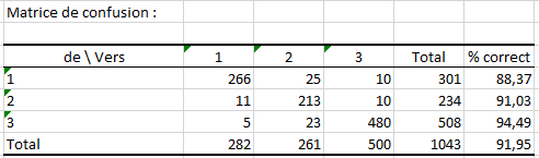 Le tableau qui suit donne la matrice de confusion obtenue sur l’ensemble d'apprentissage. Ces matrices donnent le niveau de performance de notre classifieur (Performances mesurées sur les données OOB). Sur le jeu d'apprentissage, nous avons obtenu 94,92% de réponses correctes.