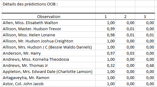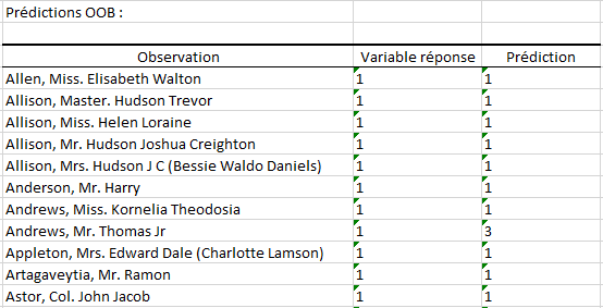 Le second tableau affiche la réponse associée à chaque observation et la classe prédite pour cette dernière (prédiction faite en utilisant uniquement les arbres dans lesquels elle est OOB).