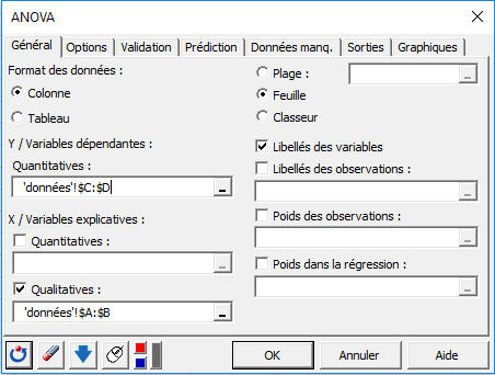 Dans l’onglet Général, sélectionner les colonnes goût et douceur en guise de variables dépendantes, et les colonnes juge et produit en tant que variables explicatives qualitatives. Dans l’onglet Options, activez l’option Interactions / niveau et sélectionnez des interactions à 2 niveaux afin que l’interaction juge x produit soit prise en compte. Dans l’onglet Sorties / Général, activez l’option Type I/II/III SS.