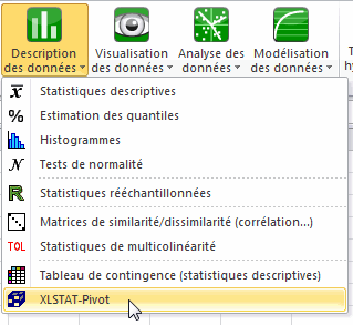 Une fois XLSTAT ouvert, sélectionnez la commande XLSTAT / Description des données / XLSTAT-Pivot, ou cliquez sur le bouton équivalent du menu Description des données (voir ci-dessous).