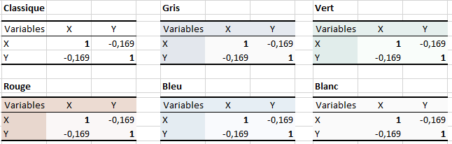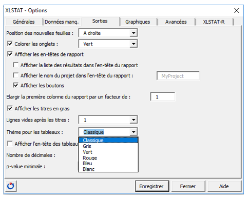 Allez dans l’onglet Sorties et cliquez sur le champ Thème pour les tableaux. Ensuite, sélectionnez un thème and cliquez sur le bouton Sauvegarder. Lors de la prochaine analyse avec XLSTAT, tous les tableaux dans la feuille de résultats seront personnalisés en fonction du thème choisi.