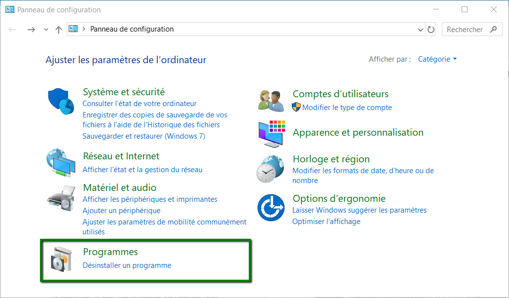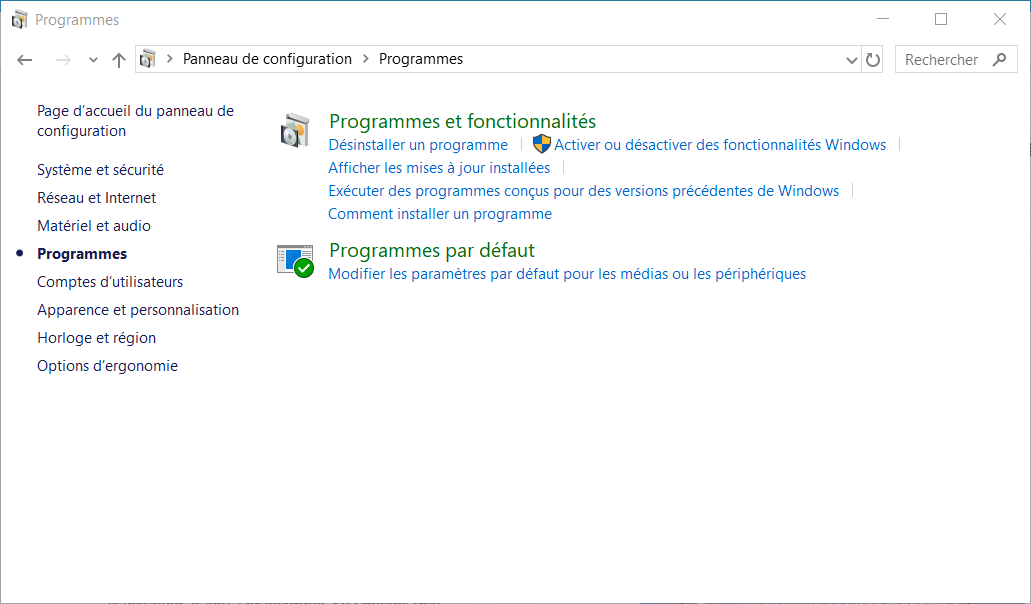 1. Accédez à votre Panneau de configuration, via la barre de recherche de votre menu démarrer, puis cliquez sur Programmes et Programmes et fonctionnalités.