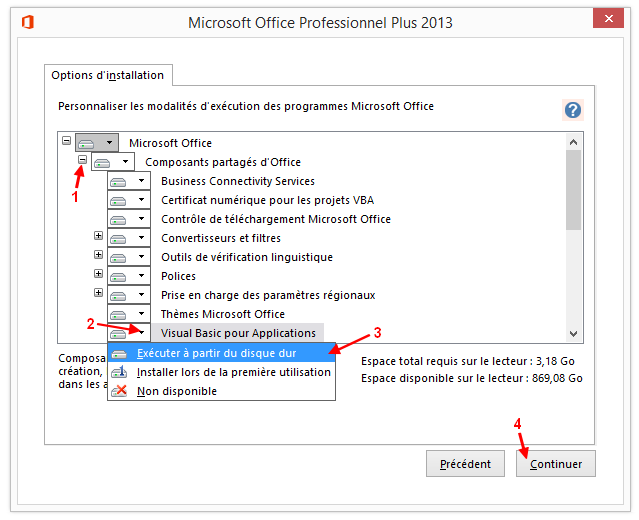 - Développez la ligne Composants partagés d'Office et rendez vous à la ligne Visual Basic pour Applications. Cliquez sur l'icône de gauche pour faire apparaître un menu déroulant. Sélectionnez l'option Exécuter à partir du disque dur.