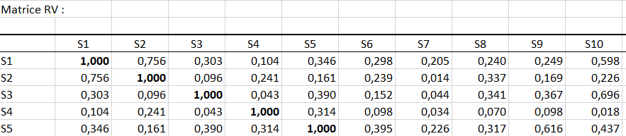 Si l’on s’intéresse à deux sujets en particulier, il est utile de regarder la matrice RV qui donne le coefficient RV entre chaque sujet (coefficient entre 0 et 1, qui augmente avec la proximité des sujets). Nous voyons ici que le sujet 1 a un avis très similaire au sujet 2, mais très différent du sujet 4 (qui a des faibles valeurs de RV avec beaucoup d’autres sujets ici).