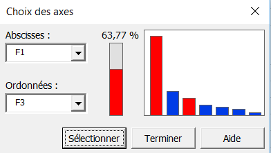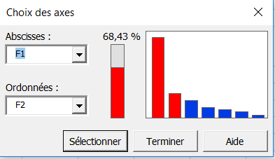 Une nouvelle boîte vous permet de choisir les axes pour lesquels les graphiques doivent être affichés. Dans notre cas, le pourcentage de variabilité représenté sur les deux premiers axes n'est pas particulièrement élevé (68.43%) ; pour éviter une mauvaise interprétation des graphiques, un affichage sur les axes 1 et 3 est donc aussi demandé.