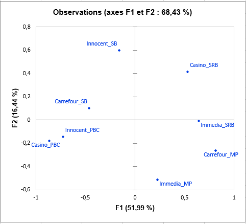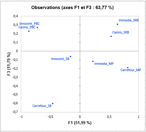 Le graphique suivant est l’objectif principal de STATIS : représenter les observations sur une carte à 2 dimensions, et ainsi identifier les proximités. Nous voyons par exemple que les smoothies « Casino_PBC » et « Innocent_PBC » sont perçus comme proches, mais qu’ils diffèrent beaucoup du « Casino_SRB ». Sur la troisième dimension, nous pouvons voir que Carrefour_SB est totalement opposé à « Casino_PBC », « Innocent_PBC », « Immedia_SRB » et « Casino_SRB ».