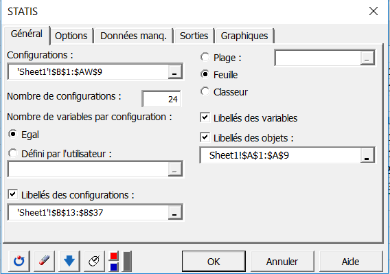 Comme les 24 configurations ont chacune deux variables, l'option Egal est choisie pour le nombre de variables. Lorsque le nombre de variables varie pour les différentes configurations, il faut sélectionner une colonne contenant le nombre de variables des différentes configurations.