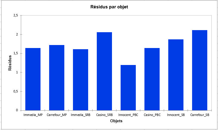 Enfin, le graphique suivant donne les résidus par objet, qui indique quels objets ont été placés plutôt de même manière par les sujets, comme le smoothie « Innocent_PBC », ou plutôt différemment, comme le smoothie « Carrefour_SB ».