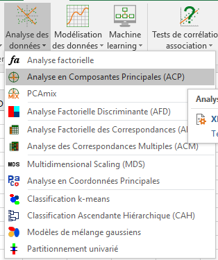 Une fois que XLSTAT est ouvert, choisissez XLSTAT / Analyse de données / Analyse en Composantes Principales (voir ci-dessous) :