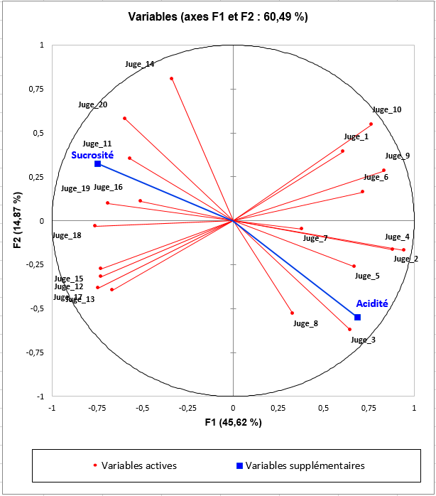 Ici, les variables supplémentaires Acidité et Sucrosité nous permettent d’identifier deux types de consommateurs : ceux qui préfèrent des produits acides et ceux qui préfèrent des produits sucrés. Sans cette information, on pourrait difficilement expliquer ce qui oriente les préférences de ces deux groupes distincts de consommateurs. Les produits situés à droite du graphique des observations seront caractérisés par une acidité et préférés par les consommateurs à droite du cercle de corrélation. A l’inverse, les produits situés à gauche du graphique des observations seront caractérisés par un goût sucré et préférés par les consommateurs situés à gauche du cercle de corrélation.