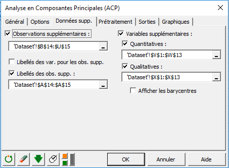 Dans l’onglet Données supplémentaires, on choisit les deux dernières lignes comme des observations supplémentaires, Acidité et Sucrosité comme variables supplémentaires quantitatives, et Texture comme une variable supplémentaire qualitative. On peut également cocher Afficher les barycentres pour les afficher sur le graphique des observations. Ici, on va simplement voir comment colorer les observations selon une variable qualitative.