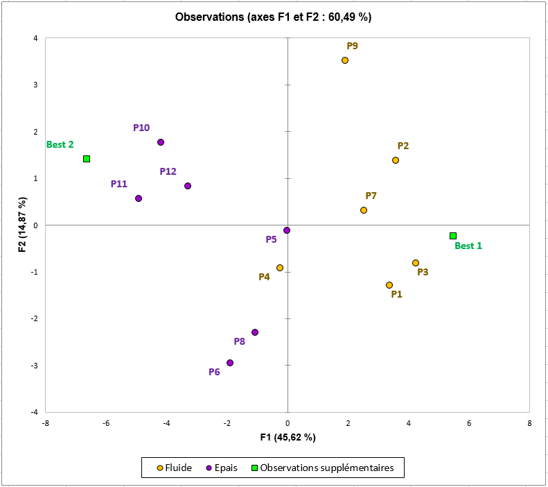 Sur ce graphique, on peut observer qu’un groupe de produits (P1,P2,P3 et P7) est préféré par le groupe de juges à droite du cercle de corrélations. Ces juges aiment l’acidité de ce groupe de produits. Le prototype Best 1 semble s’inscrire totalement dans ce groupe de produits, et peut donc être lancé sur le marché. De plus, on observe que ce groupe de produits sont tous caractérisés par une texture fluide. Les nouveaux prototypes développés pour cette catégorie de consommateurs devront être acides et de texture plutôt liquide. En revanche, un autre groupe de produits (P10, P11 et P12) plaisent aux juges situés à gauche du cercle de corrélations. Ce groupe de consommateurs semble être attiré par un goût plus sucré et une texture plus épaisse. Best 2 semble un bon candidat pour répondre aux attentes de ces consommateurs.