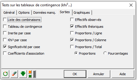 Dans l’onglet Sorties, activez les options Effectifs théoriques et Proportions/ colonnes.
