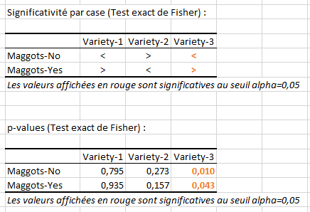 Le tableau Proportions / Colonne affiche les proportions de bananes avec / sans asticots pour chacune des trois variétés. Le résultat des tests montre qu’au moins une des proportions (0.121, 0.104 et 0.300) est significativement différente des autres.